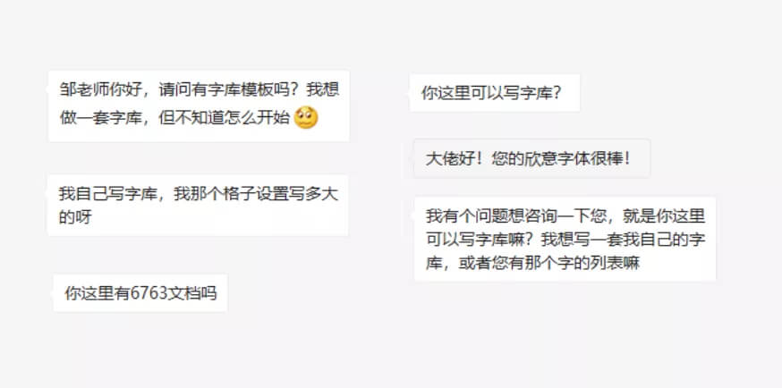 此外我還有接收到很多關(guān)于怎么做字庫(kù),我會(huì)寫(xiě)但不知道怎么做,也不知道寫(xiě)哪些字的問(wèn)題,也沒(méi)辦法每個(gè)來(lái)問(wèn)的都一一解答一遍,然而我解答完可能還是不知道怎么開(kāi)頭。