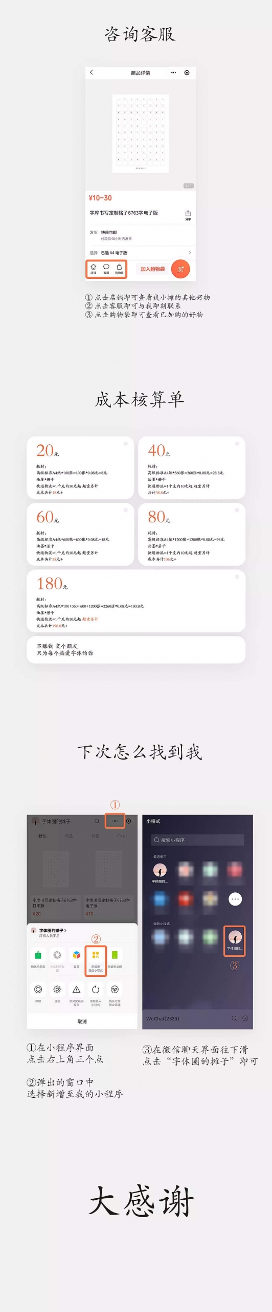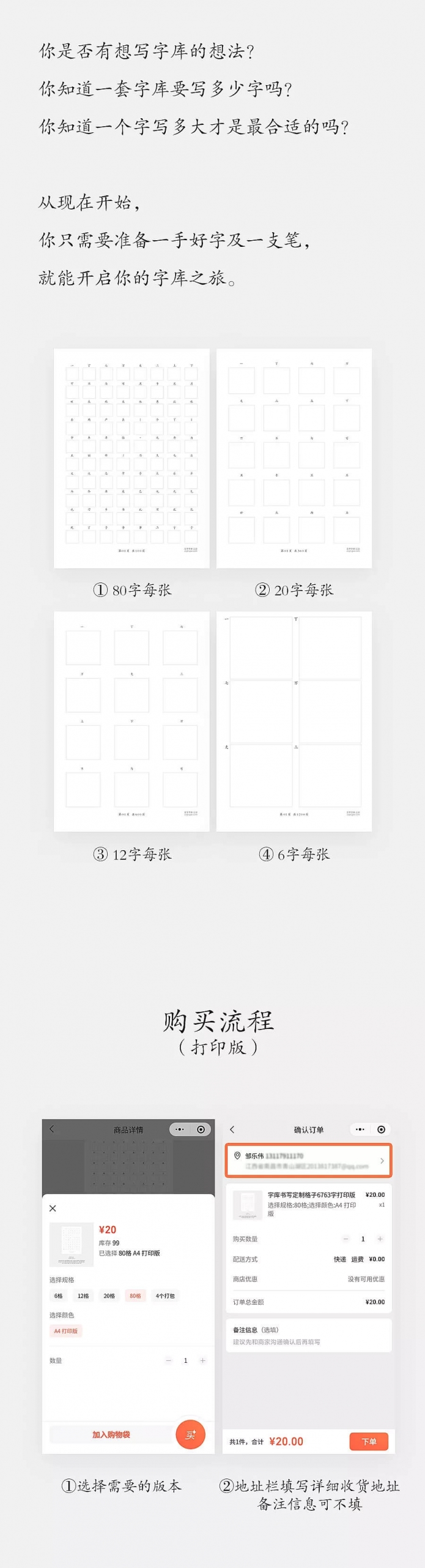 一共分為電子版和打印版,所以如果你有打印機(jī)以及紙張的話,可以購(gòu)買(mǎi)電子版自行打印,打印版則為我?guī)湍愦蛴『眉慕o你,全部寫(xiě)完之后可以給字庫(kù)公司投稿,也可以自己開(kāi)發(fā)字庫(kù),也可以聯(lián)系我開(kāi)發(fā)出字庫(kù)。
