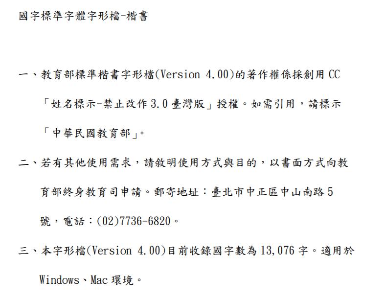 一、教育部標(biāo)準(zhǔn)楷書字形檔(Version 4.00)的著作權(quán)係採創(chuàng)用CC 「姓名標(biāo)示-禁止改作3.0臺灣版」授權(quán)。如需引用,請標(biāo)示「中華民國教育部」。